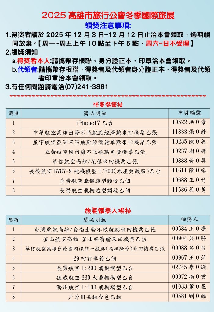 中獎名單-2025高雄冬季國際旅展摸彩活動